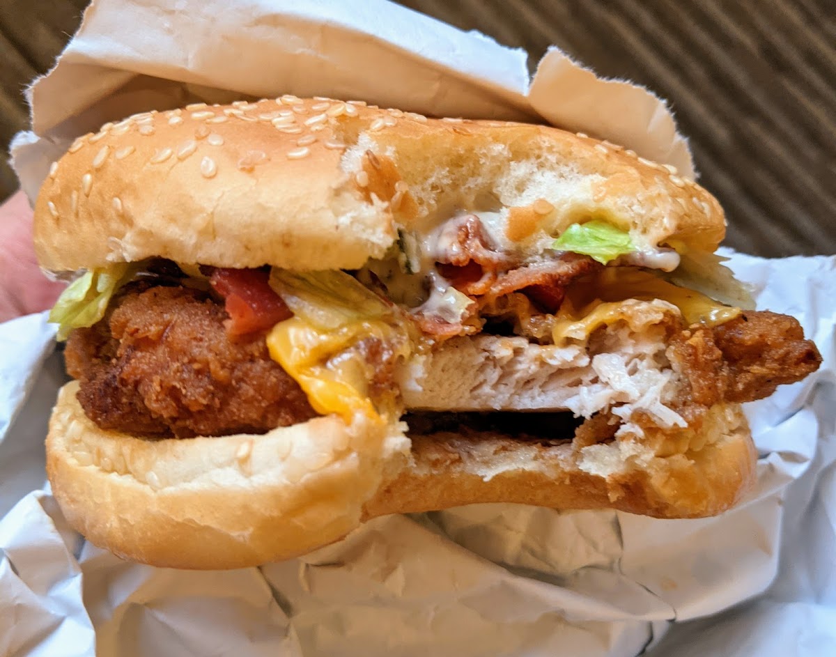 Chicken Club Burger: Packed with grilled chicken, fresh veggies, and savory sauce - a tasty choice for those craving something light yet filling.